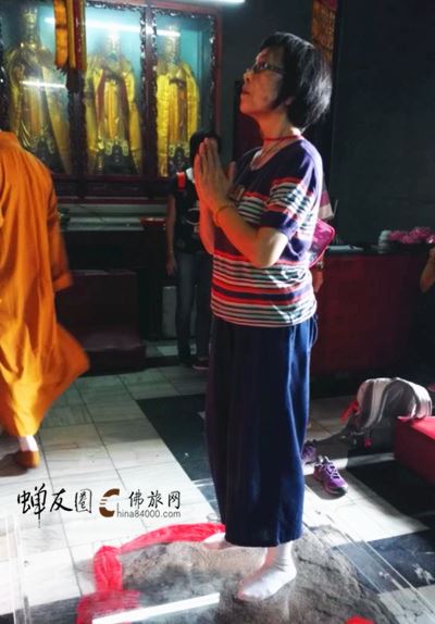 在拜经台,台内有一块长方形岩石,上有凹下的脚印。传说,当年金地藏就在这块凸出的平台上拜经,该石即是跑拜时的垫脚石,因而留下了足印。团员们纷纷上前虔诚顶礼、叩拜,感受菩萨殊胜的加持力。